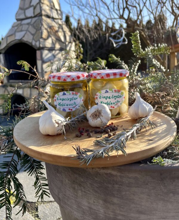 Das Knoblauch gesund ist, ist jedem bekannt.Durch das einlegen mit Essig verliert der Knoblauch ein wenig den strengen Geruch. Er schmeckt lecker auf einer deftigen Wurstschnitte. Den Sud wiederum kann man gut auf Blattsalat verwenden.